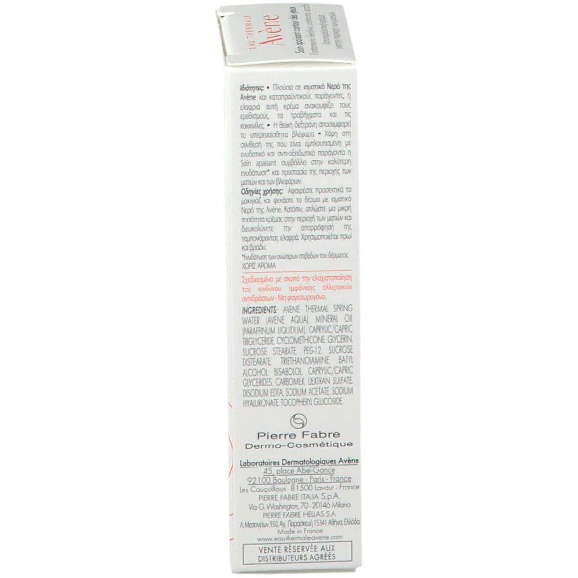 Avene Thermal Spring Water (Avene Aqua). Mineral Oil (Paraffinum Liquidum). Caprylic/Capric Triglyceride. Cyclomethicone. Glycerin. Sucrose Stearate. Peg-12. Sucrose Distearate. Triethanolamine. Batyl Alcohol. Bisabolol. Caprylic/Capric Glycerides. Carbomer.