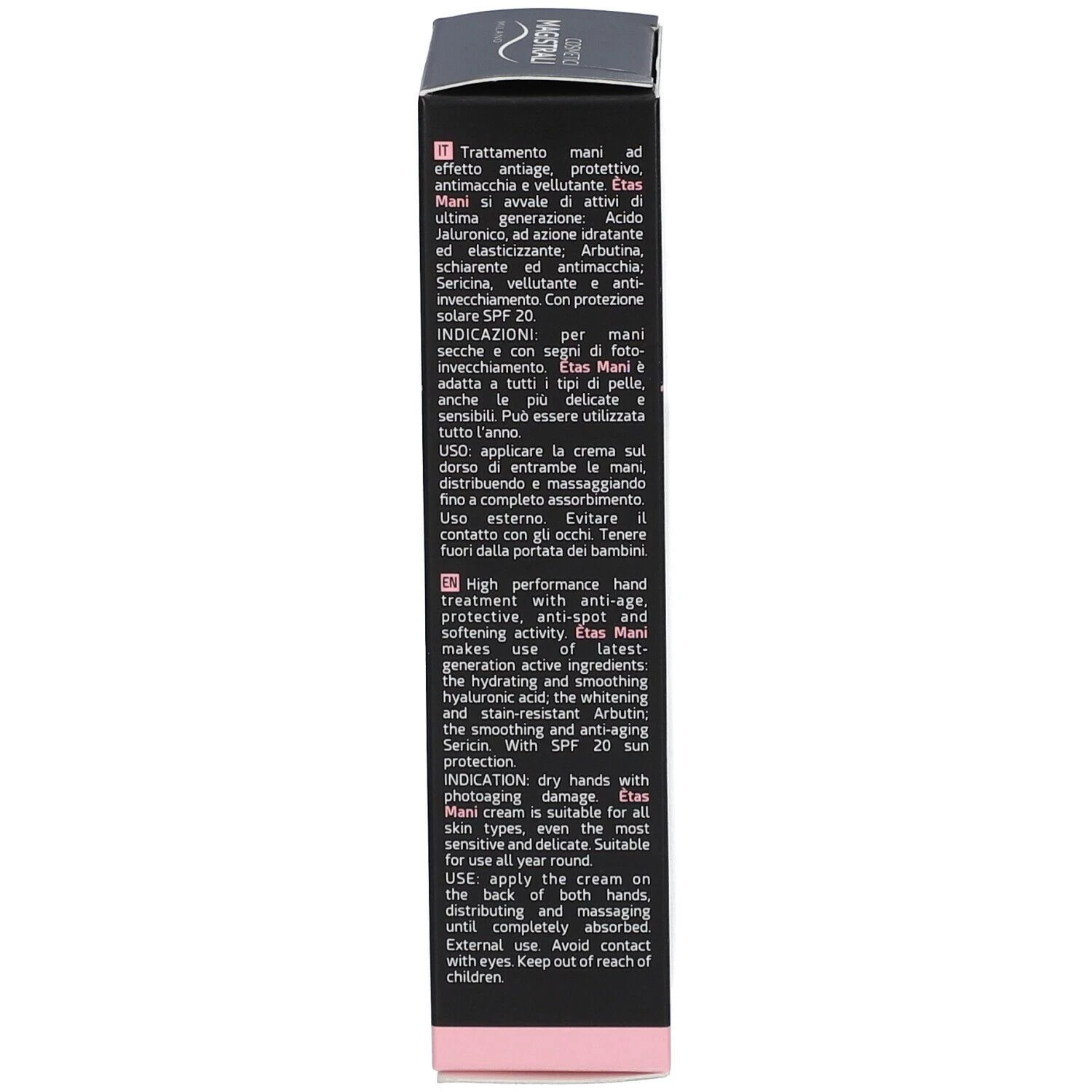 Ètas Mani si avvale di attivi di ultima generazione: Acido Jaluronico, ad azione idratante ed elasticizzante, Arbutina, schiarente ed antimacchia, Sericina, vellutante e antinvecchiamento.