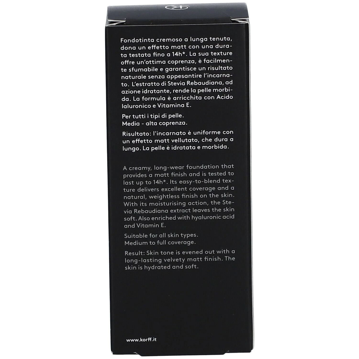 Fondotinta a lunga tenuta, dona un effetto matt con una tenuta testata fino a 14h*. La sua texture offre un’ottima coprenza, è facilmente sfumabile e garantisce un risultato naturale senza appesantire l’incarnato. L’estratto di Stevia Rebaudiana, ad azione idratante, rende la pelle morbida. La formula è arricchita con Acido Ialuronico e Vitamina E.