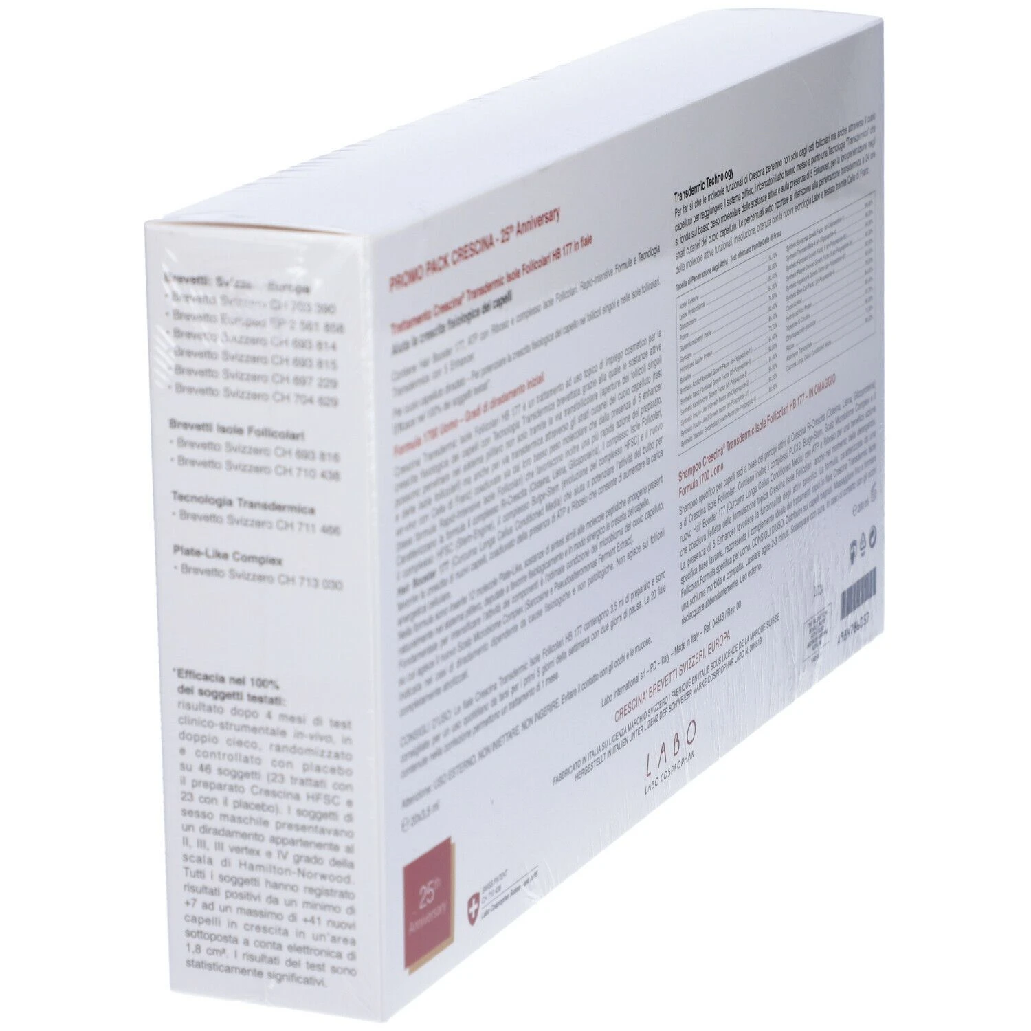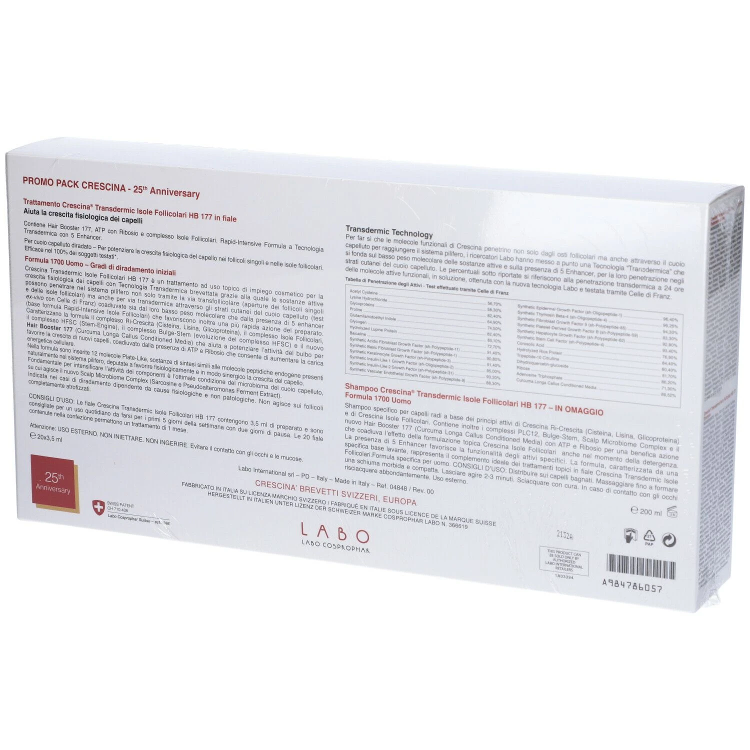 La nuova Crescina Transdermic Ri-Crescita HB 177 rinnova la propria formulazione concentrando in un’unica fiala esperienza e tecnologie d’avanguardia: assieme al complesso Ri-Crescita, al complesso HFSC e al complesso Bulge-Stem, Labo introduce il nuovo Hair Booster 177 che aiuta a potenziare l’attività della papilla dermica alla base del bulbo per favorire la crescita di nuovi capelli, coadiuvato dalla presenza di ATP e Ribosio che consente di aumentare la carica energetica cellulare. La formula include inoltre 12 molecole Plate-Like (sostanze di sintesi simili alle molecole peptidiche endogene presenti naturalmente nel sistema pilifero e deputate a favorire fisiologicamente e in modo sinergico la crescita del capello) e lo Scalp Microbiome Complex (Sarcosine e Pseudoalteromonas Ferment Extract) la cui condizione ottimale è fondamentale per intensificare l’attività dei componenti.