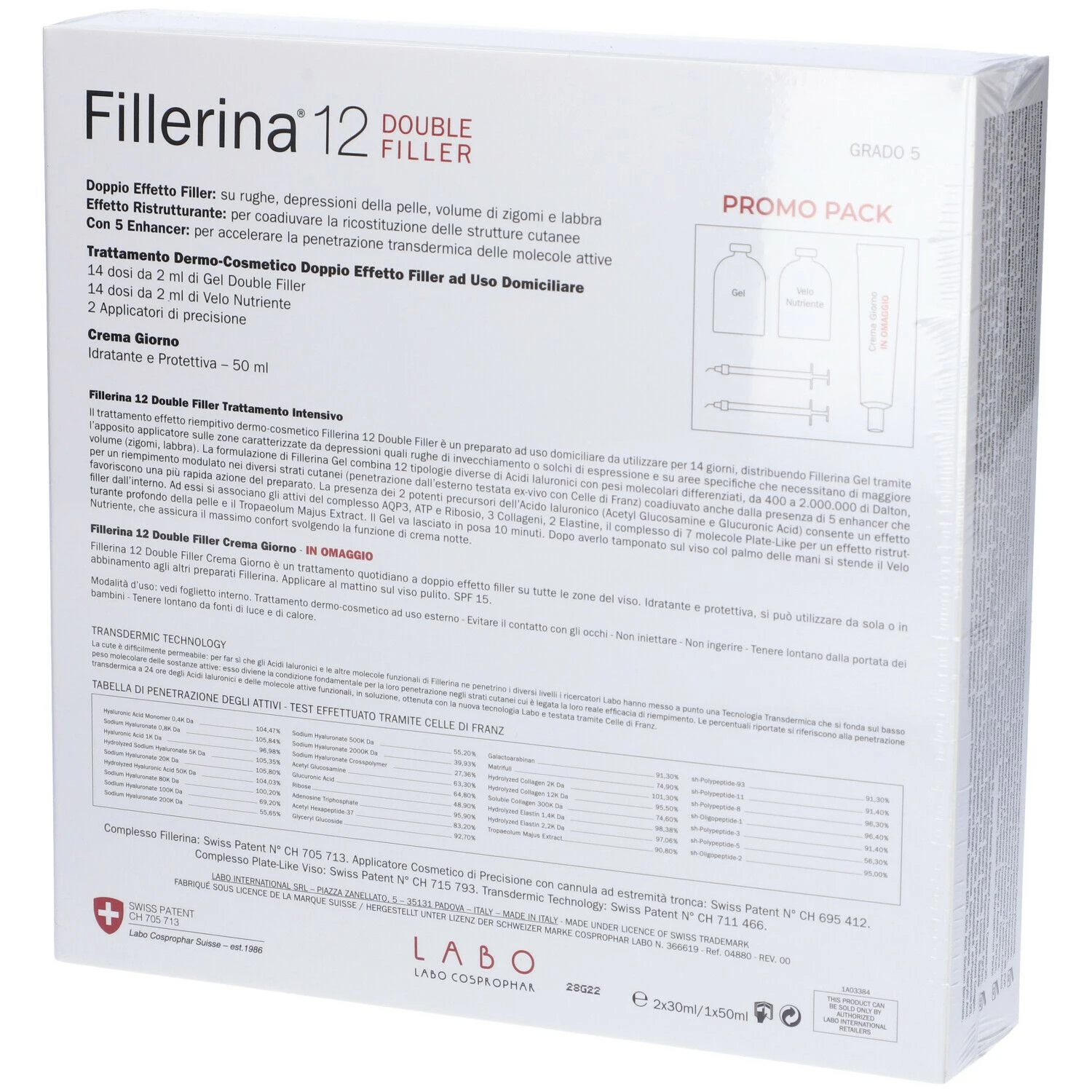 Fillerina 12 Double Filler è un trattamento effetto filler dermo-cosmetico da fare a casa: per la sua modalità d’azione viene proposto come intervento riempitivo ad uso domiciliare di impiego cosmetico con applicazioni esterne a rapida penetrazione, senz’ago. Il suo nome si ispira al meccanismo di riempimento delle depressioni del viso e di volumizzazione di zone specifiche (test in-vivo) grazie all’effetto di 12 speciali Acidi Ialuronici di diverso peso molecolare per un diverso livello di riempimento dei segni di espressione (rughe e solchi), delle rughe di invecchiamento e del microrilievo, e delle zone del viso sottoposte a perdita di volume e svuotamento (ovale del viso, zigomi, superficie delle labbra).