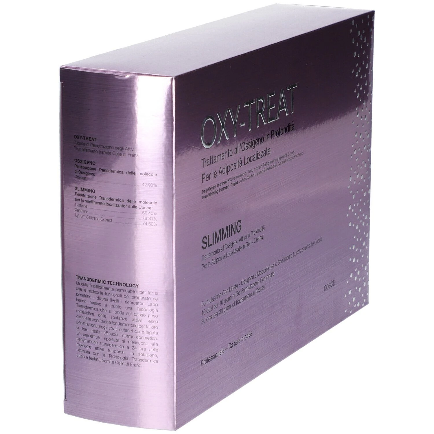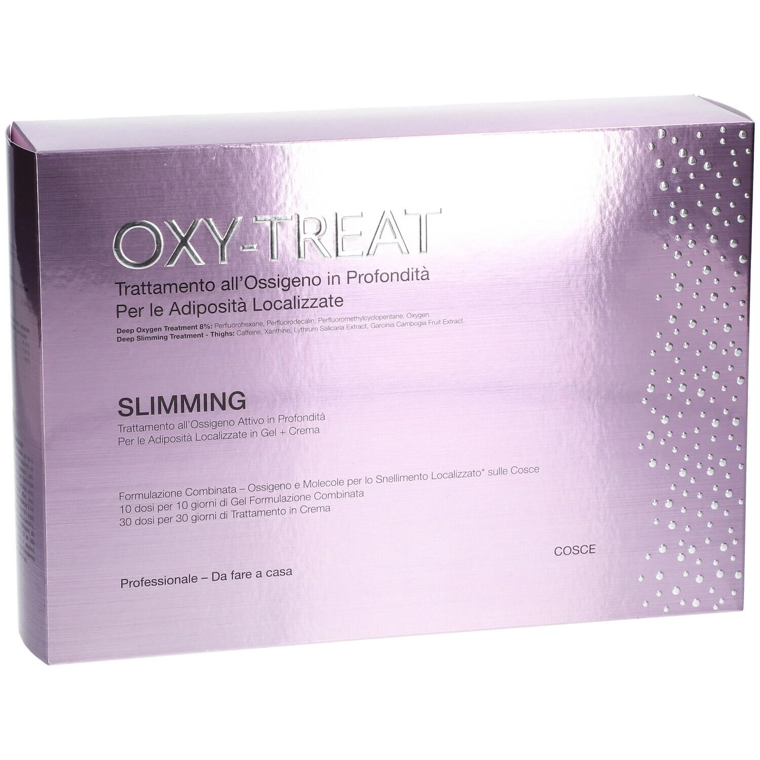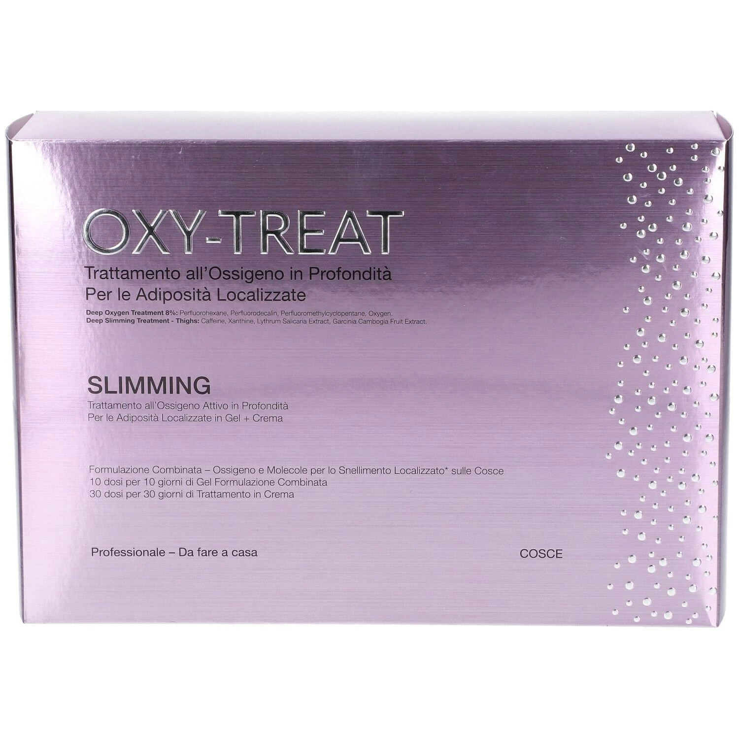 Il Trattamento Intensivo Oxy-Treat Slimming Cosce – Trattamento all’ossigeno in profondità – contenuto in un cofanetto che comprende il Gel a formulazione combinata (ossigeno PFC all’8% e molecole specifiche per le adiposità localizzate sulle cosce; in flacone da 100ml) da utilizzare per 10 giorni, e la Crema a formulazione combinata (ossigeno PFC al 2% e molecole specifiche per le adiposità localizzate sulle cosce in dispenser da 100ml) da utilizzare per 30 giorni.