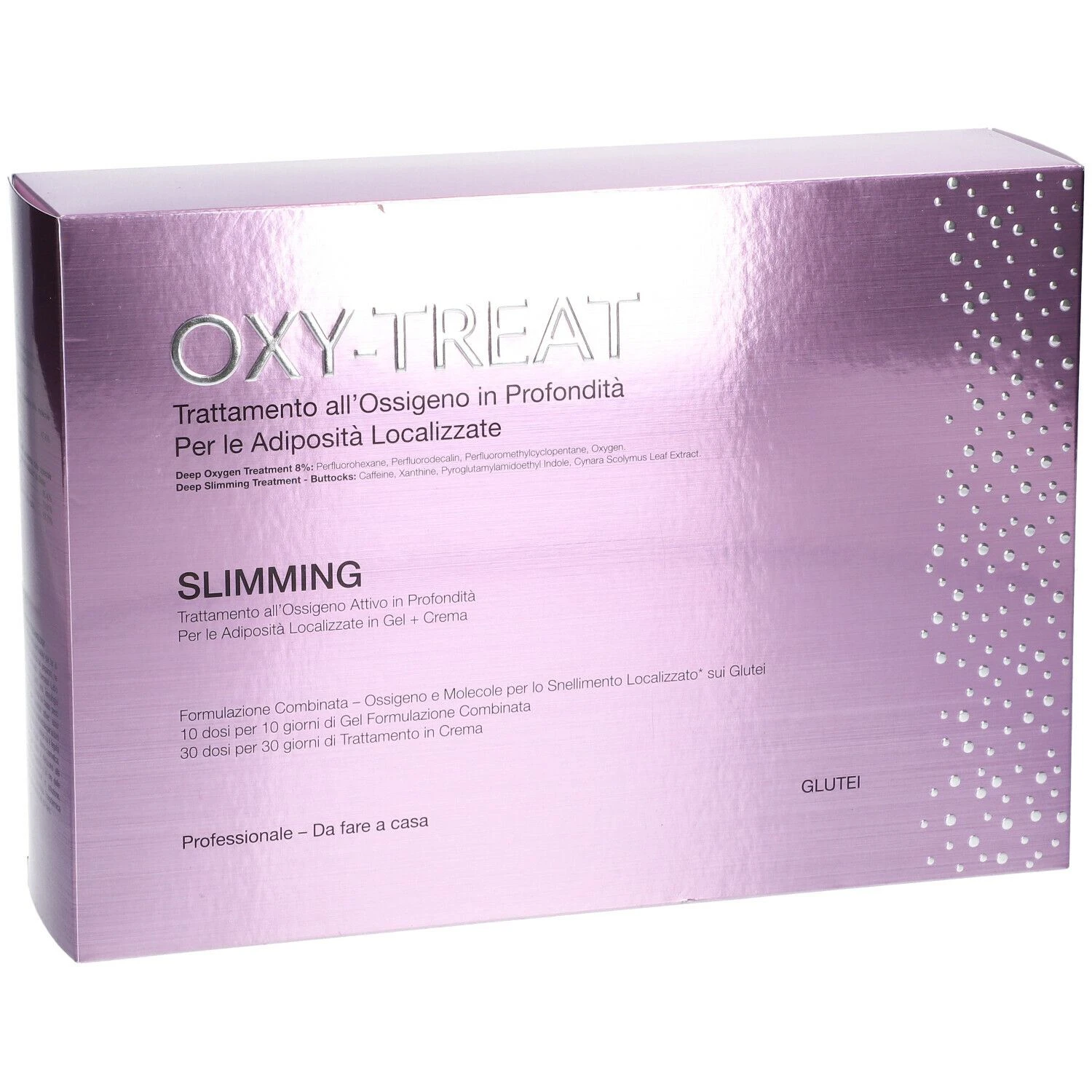 Il Trattamento Intensivo Oxy-Treat Slimming Glutei – Trattamento all’ossigeno in profondità – contenuto in un cofanetto che comprende il Gel a formulazione combinata (ossigeno PFC all’8% e molecole specifiche per le adiposità localizzate sui glutei; in flacone da 100ml) da utilizzare per 10 giorni, e la Crema a formulazione combinata (ossigeno PFC al 2% e molecole specifiche per le adiposità localizzate sui glutei in dispenser da 100ml) da utilizzare per 30 giorni.