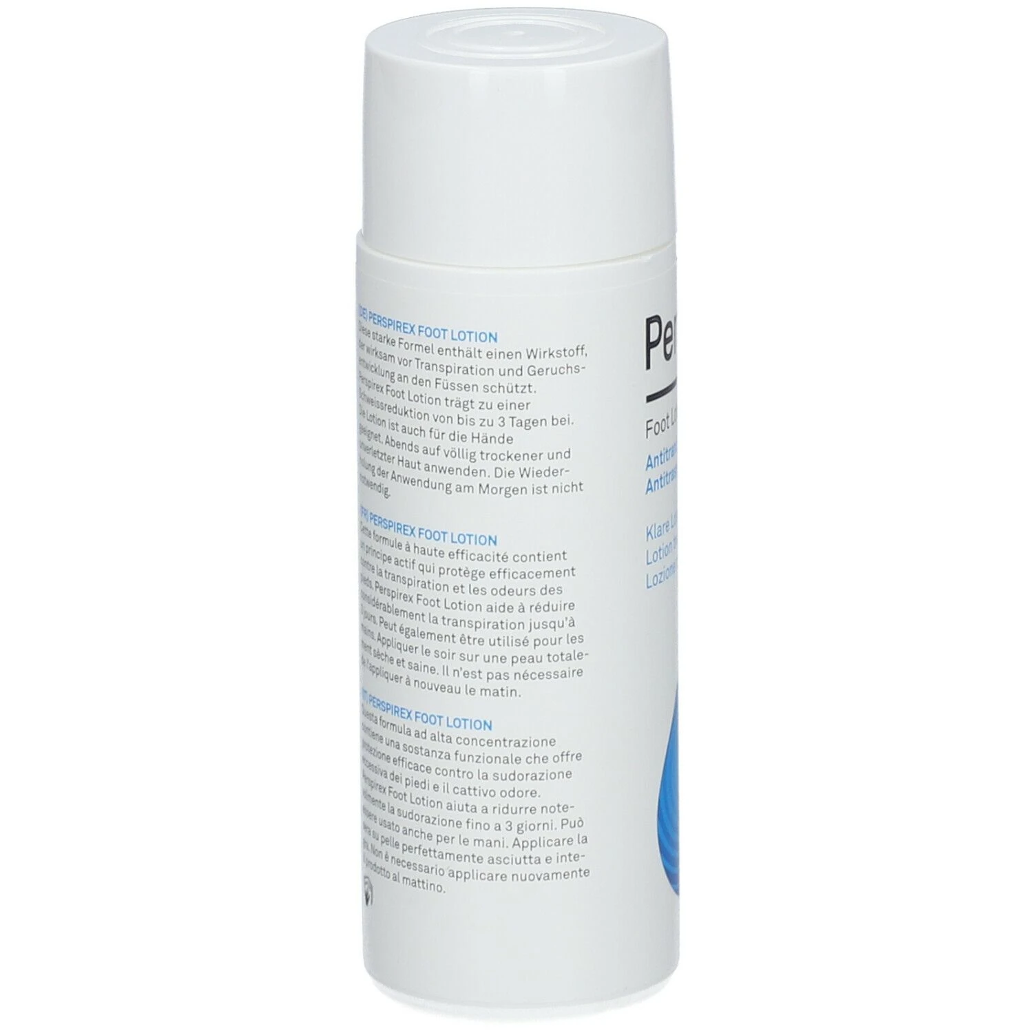 La lozione antitraspirante di Perspirex per mani e piedi è stata creata per eliminare il problema del sudore di mani e piedi e il cattivo odore che spesso si forma. La formula della lozione è più concentrata rispetto a quella del roll-on per le ascelle offrendo una copertura efficace e duratura. Il suo effetto svanisce, tramite il naturale processo di rinnovamento della pelle, in pochi giorni. Inoltre la lozione Perpsirex per mani e piedi è senza profumazione e senza conservanti e non macchia i vestiti.