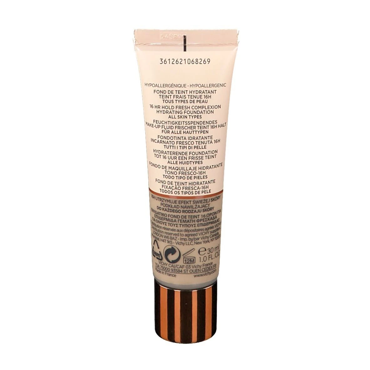 Fondotinta idratante a base d’acqua. La sua formula è ricca di attivi come l’acqua minerale Vichy, acido ialuronico di origine naturale e pigmenti minerali.